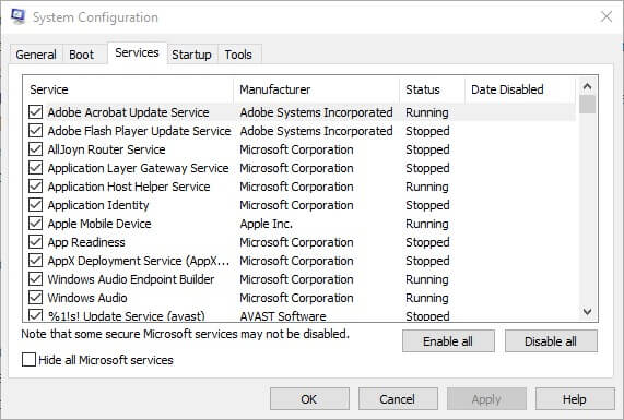 - Поставьте галочку Скрыть все службы Майкрософт, затем снимите галочки с ненужных сторонних служб.