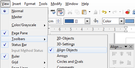 Если панели не видны, включите их в меню: Вид > Панели инструментов > Элементы формы и Вид > Панели инструментов > Выравнивание.