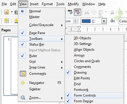 Чтобы добавлять поля формы, включите Панель «Элементы формы»: Вид > Панели инструментов > Элементы формы. Для редактирования полей включайте режим редактирования (иконка с маленькой ручкой на панели элементов формы). В режиме редактирования вы можете настраивать свойства каждого поля; выключив режим, вы переходите в режим тестирования.