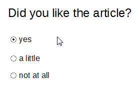 - Присвойте группе радиокнопок одно общее имя (например, liked-it), а каждой кнопке — метку и уникальное значение (например: yes, a-little, not-at-all).
