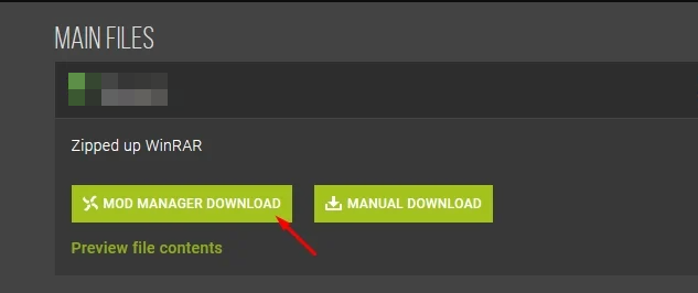 - На сайте Nexus нажмите «Mod Manager Download» — скачанный файл будет отправлен в менеджер и установится автоматически.