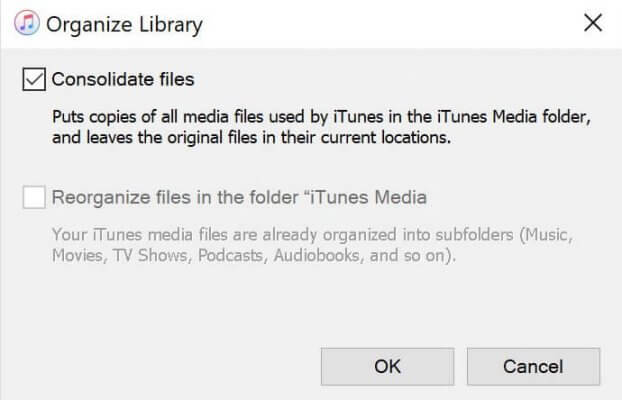 - Отметьте Consolidate files и нажмите OK. Это скопирует в папку iTunes Media все файлы, находившиеся вне неё.