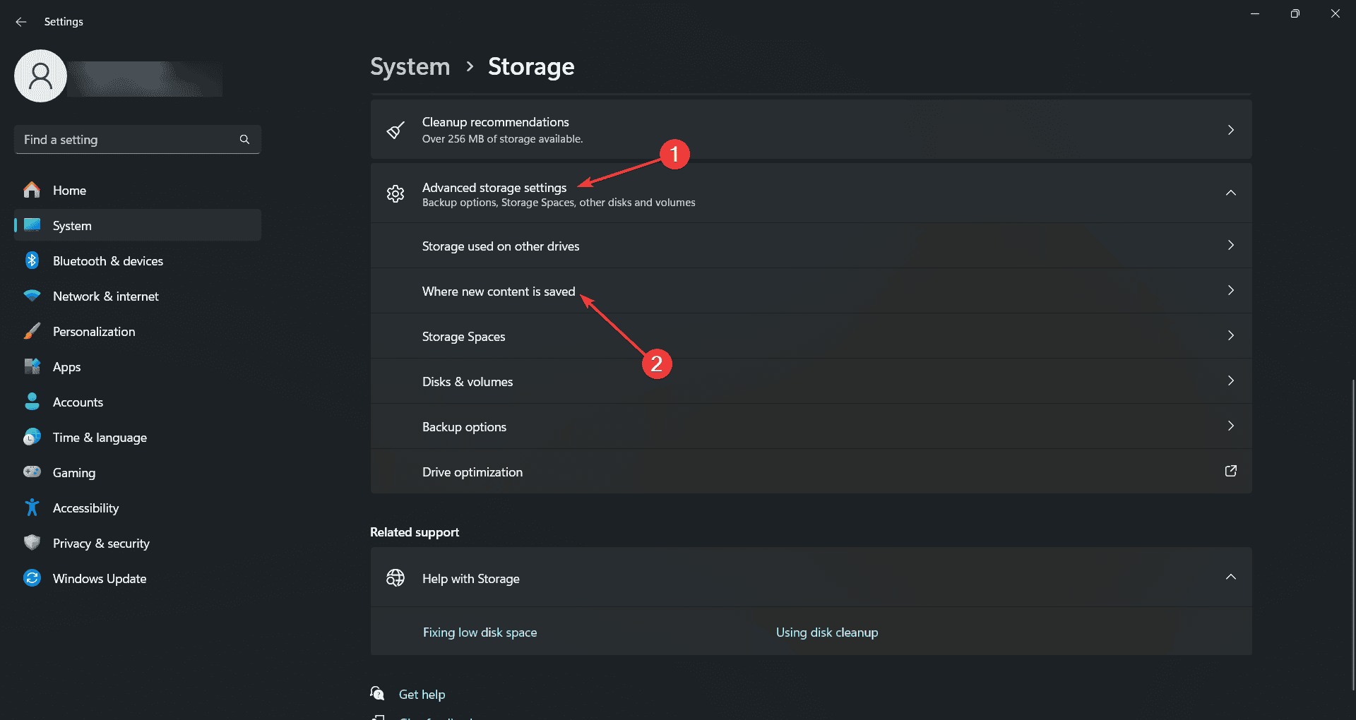- Нажмите Куда сохраняется новый контент в разделе Дополнительные параметры хранилища.