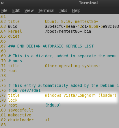 lockотдельно в строке сразу после строки заголовка записи. Пример фрагмента menu.lst: