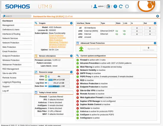 - Sophos UTM подходит для домашнего и малого корпоративного использования как полноценный UTM с возможностью создания DMZ.