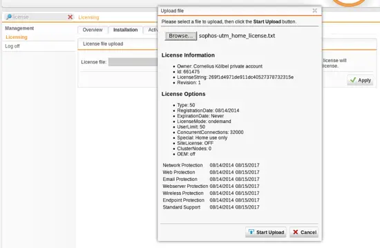 - Зарегистрируйтесь на сайте Sophos и получите файл домашней лицензии. В менеджере найдите раздел лицензий и загрузите файл.
