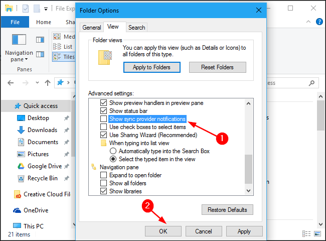 - В новом окне выберите вкладку «Вид», в разделе «Дополнительные параметры» снимите флажок «Показывать уведомления поставщика синхронизации» и нажмите «ОК».