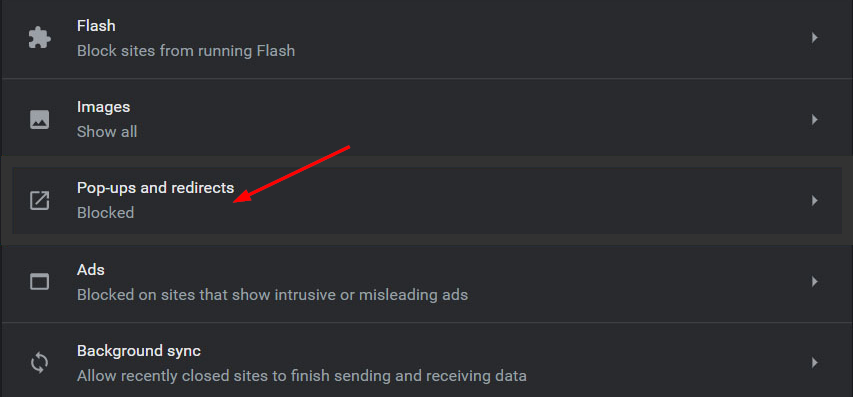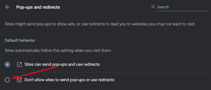 - Включите опцию «Не разрешать сайтам отправлять всплывающие окна или перенаправления».
