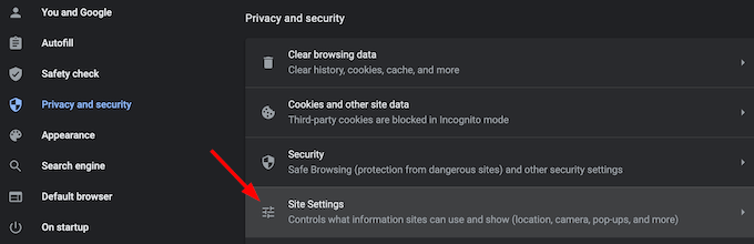 - Перейдите в «Конфиденциальность и безопасность» → «Параметры сайтов».