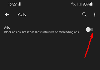 - Нажмите «Реклама» и отключите переключатель, чтобы блокировать навязчивую рекламу.