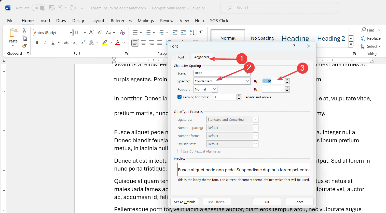 - Настроить интервал символов (Уплотнить 0,05–0,3 пт как тест).