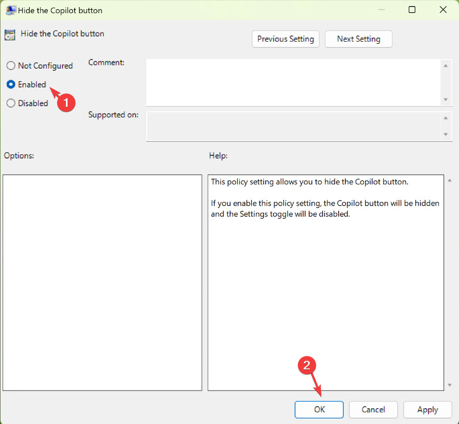 - Откройте Turn off Windows Copilot, выберите Enabled и нажмите OK.