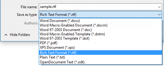 ALT: Диалог сохранения файла в формате Rich Text Format в Word