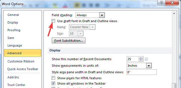 ALT: Параметры отображения документа в Word с опцией «Шрифт черновика» и «Заполнители для рисунков»