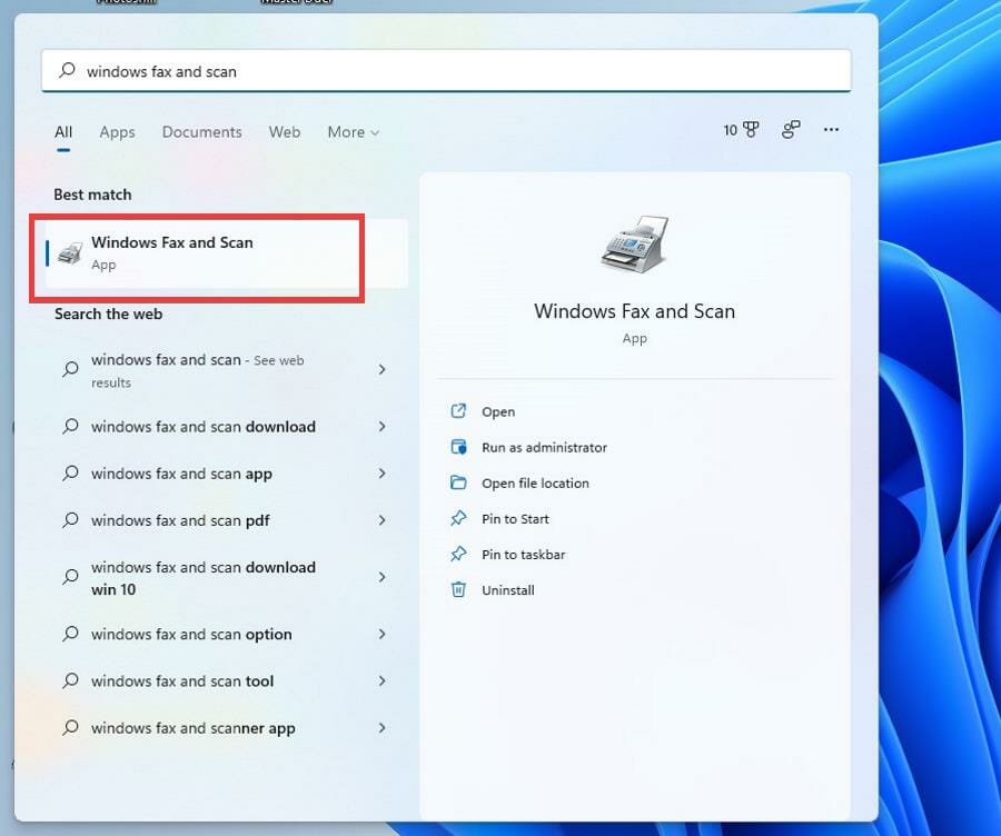 - Откройте поиск и найдите «Windows Fax and Scan».