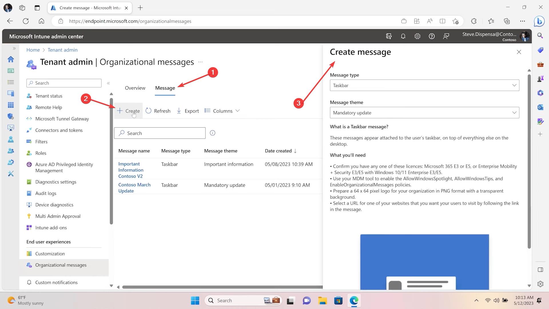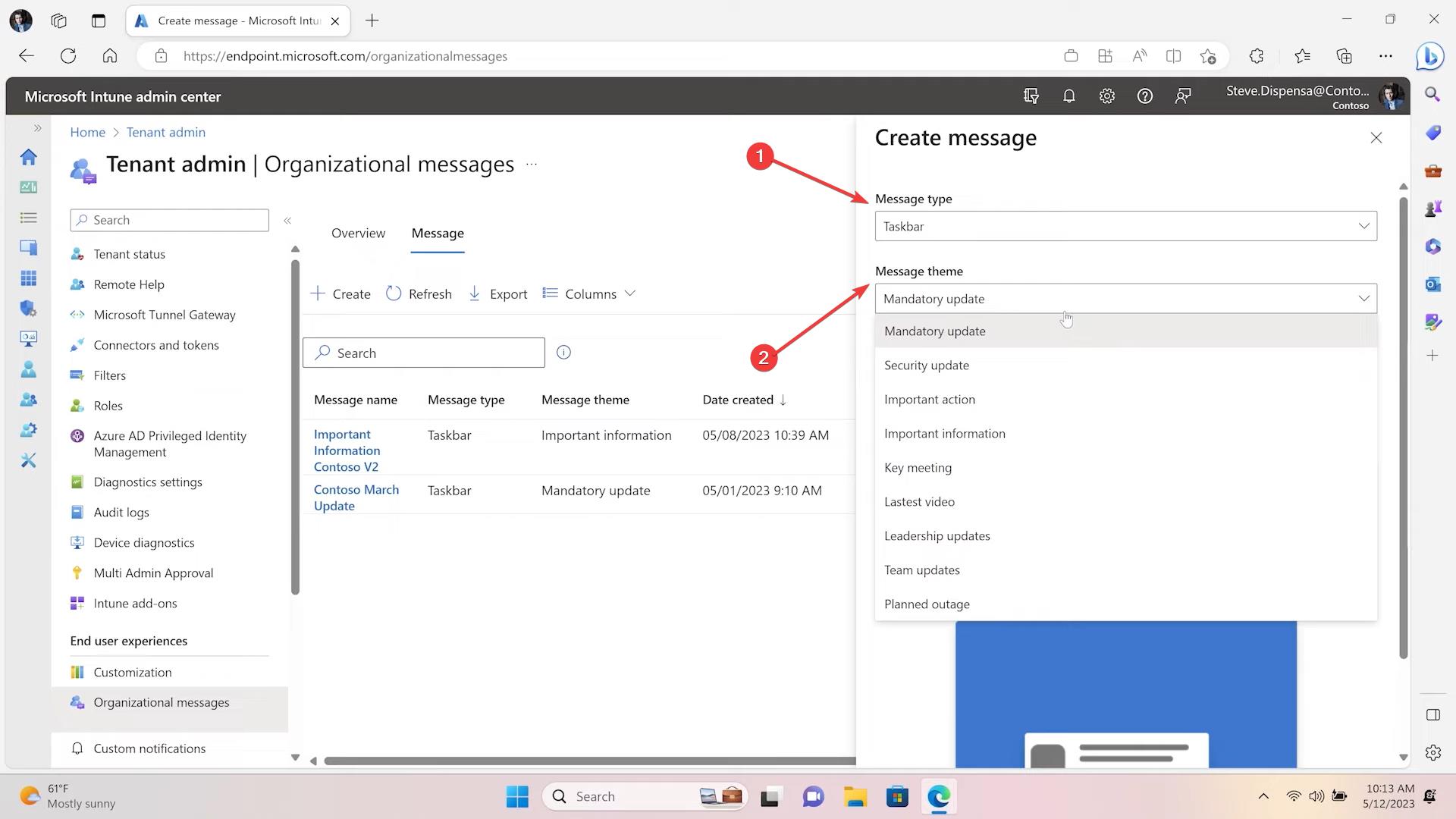 - В панели выберите раздел End user experiences, затем пункт Organizational messages.