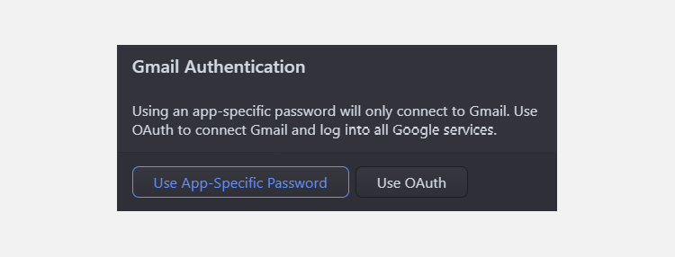 - Выберите способ авторизации: OAuth или Use App-Specific Password. Рекомендуется OAuth — это безопасно и удобно.