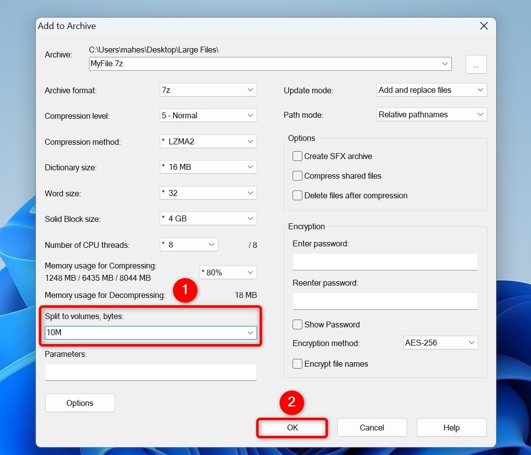 10M.Опционально настройте формат архива и сжатие. Нажмите ОК — 7‑Zip создаст несколько файлов с именем исходного файла и суффиксами