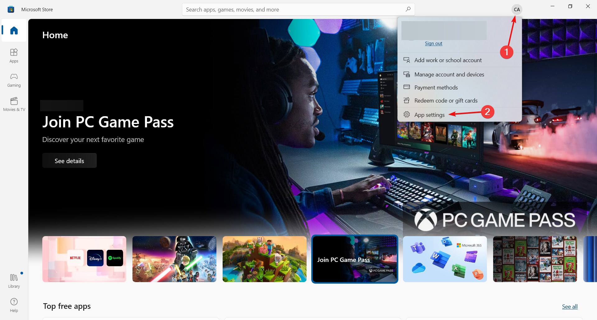 - Нажмите меню с вашей учетной записью и выберите “Параметры приложений” (App settings).