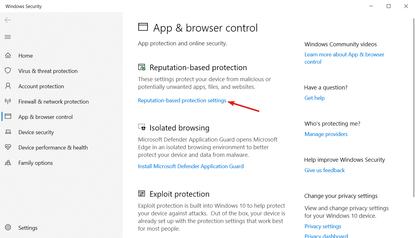 - Нажмите “Параметры защиты репутации” (Reputation-based protection settings).