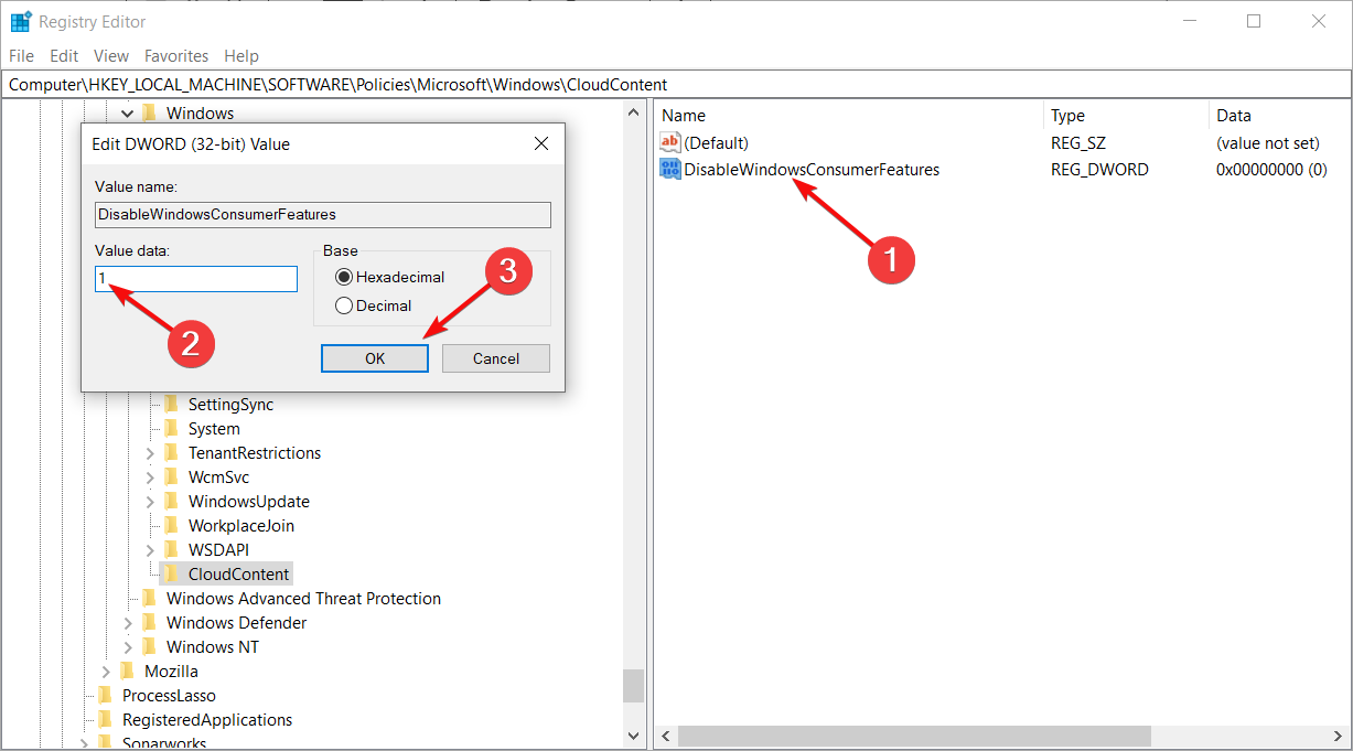 DisableWindowsConsumerFeaturesи установите Value data в1, затем нажмите OK.