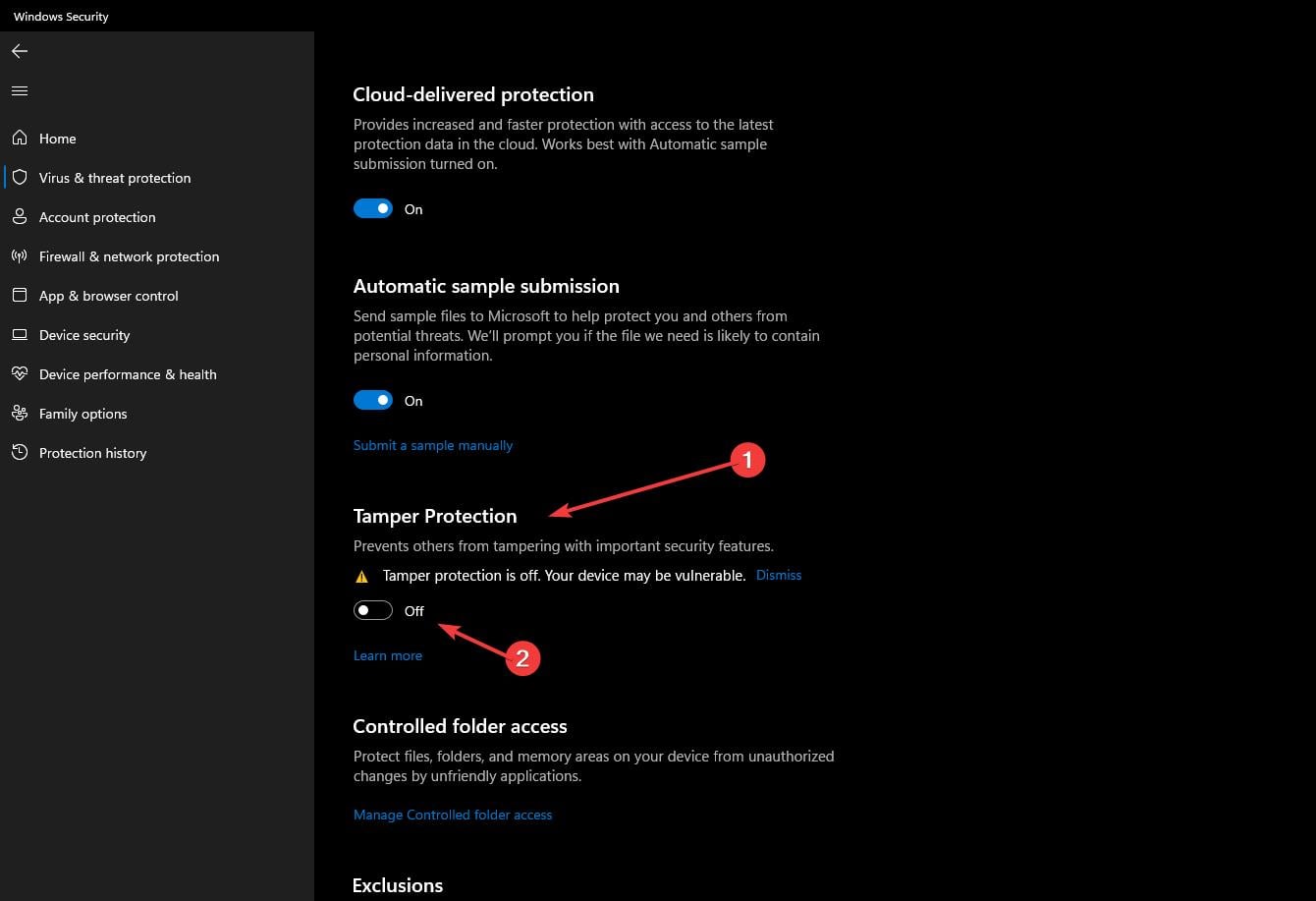 - Функция «Защита от изменений» (Tamper Protection) автоматически включает ключевые параметры защиты, в том числе повторно активирует защиту в реальном времени после её выключения. После крупных обновлений Windows эта функция может снова включиться автоматически.