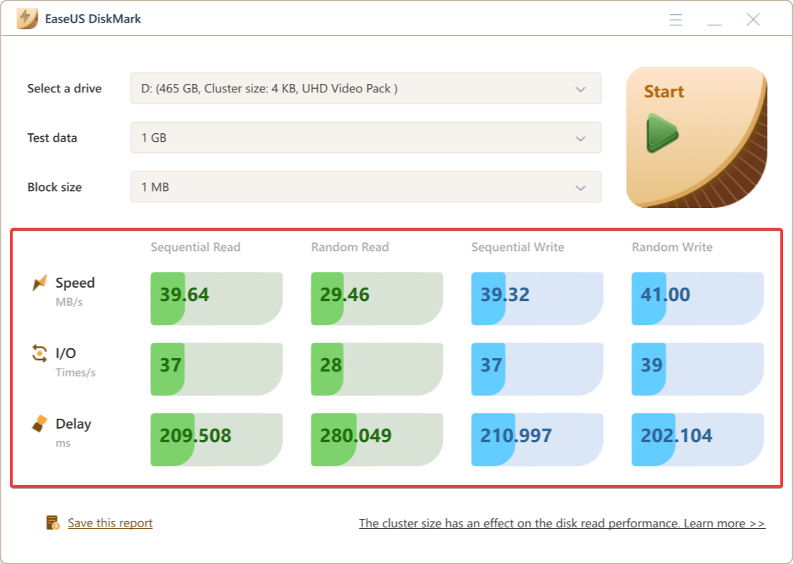 - Нажмите Start и дождитесь завершения. В отчёте будут показаны последовательные и случайные скорости чтения/записи, I/O и задержки.