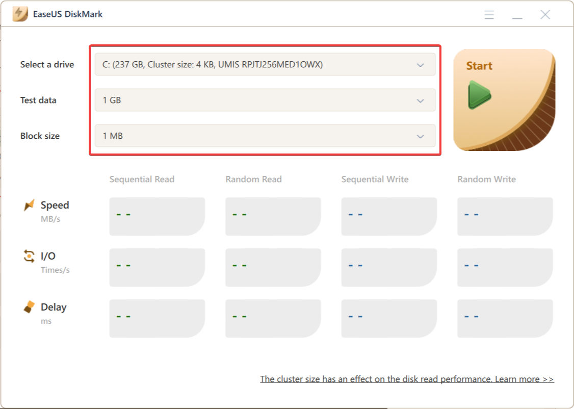 - В окне DiskMark выберите диск, объём тестовых данных и размер блока для операций.