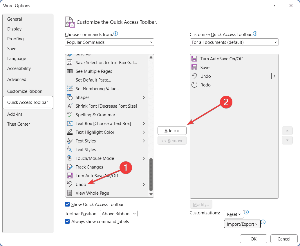 - В окне Параметры Word найдите и добавьте команды Отменить и Повторить в панель быстрого доступа, если их там нет.