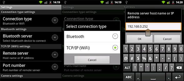 Изображение: экран настроек SmartCam на Android, показывающий выбор TCP/IP и поле для ввода IP‑адреса сервера.