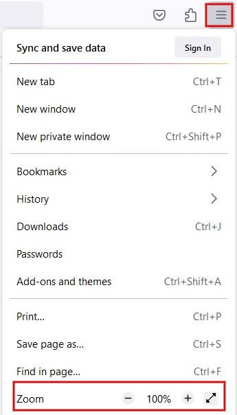 - Откройте меню (гамбургер) и используйте блок “Масштаб” с + и −.