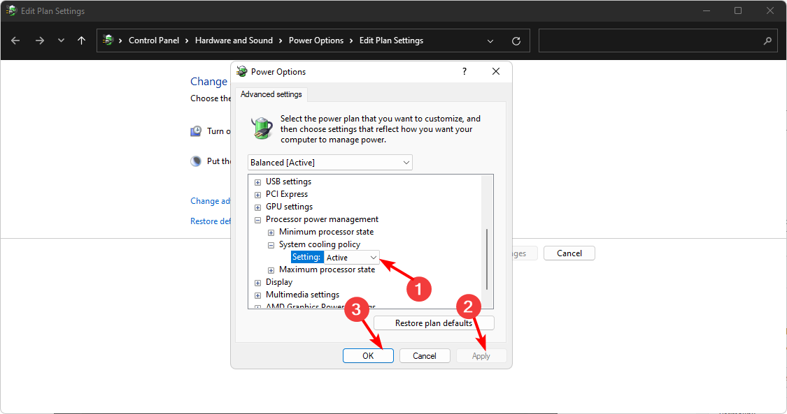 - В разделе Политика охлаждения системы измените значение на Пассивное.