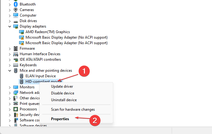 devmgmt.mscи откройте Диспетчер устройств. - Правой кнопкой кликните по беспроводной мыши и выберите «Свойства».