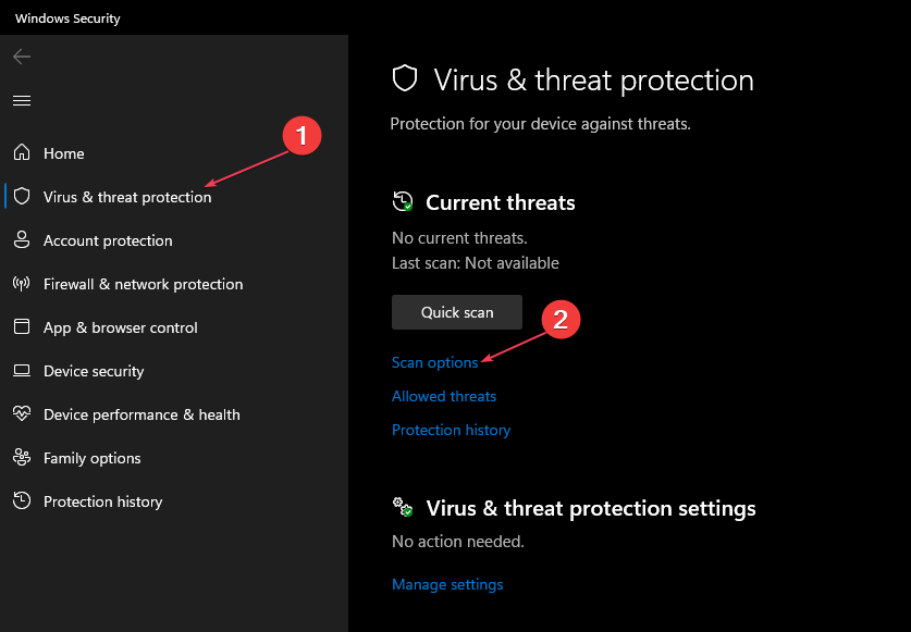 - Откройте раздел “Защита от вирусов и угроз”, затем нажмите “Параметры сканирования” под текущими угрозами.