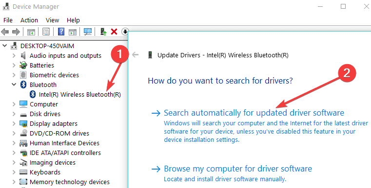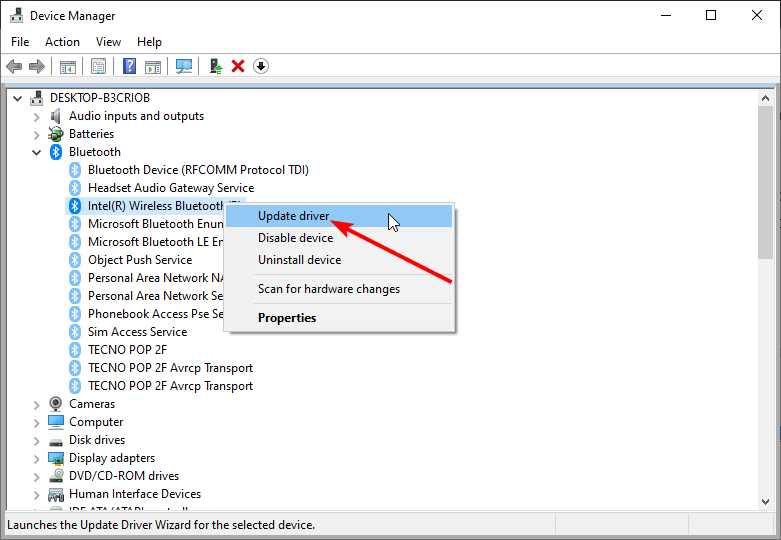 - Правой кнопкой мыши на Bluetooth‑адаптере → Обновить драйвер.