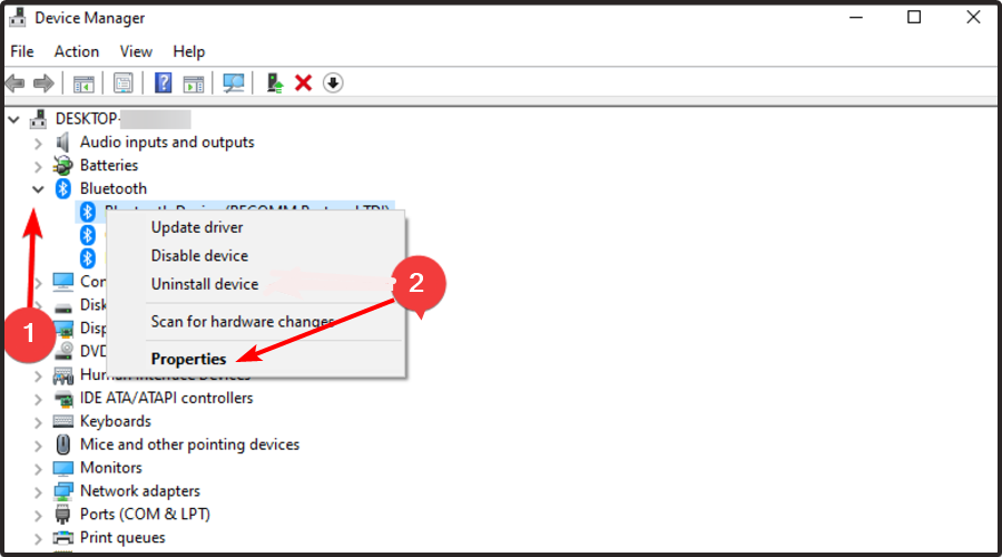 - Найдите раздел Bluetooth, раскройте список, правой кнопкой мыши откройте выбранный адаптер и выберите “Свойства”.