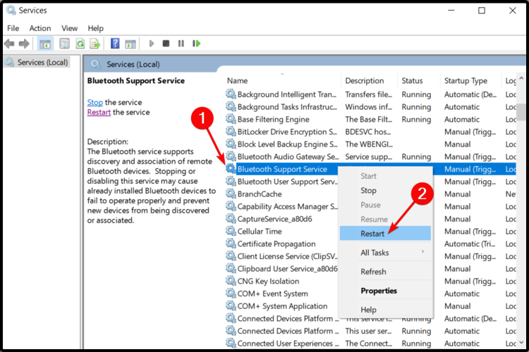 - Найдите “Bluetooth Support Service” (Служба поддержки Bluetooth), правым кликом — Перезапустить.