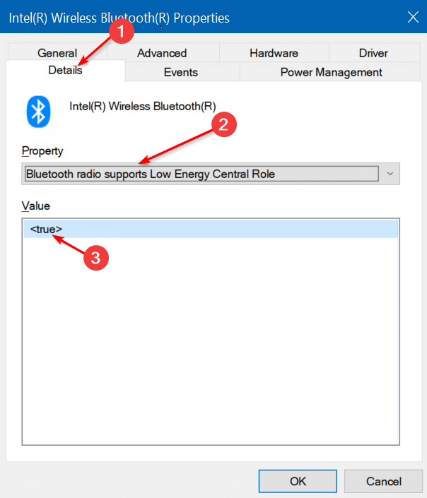 - Перейдите на вкладку “Сведения” и в списке свойств выберите параметр, связанный с ролями Bluetooth LE: “Bluetooth radio supports Low Energy Central Role”.