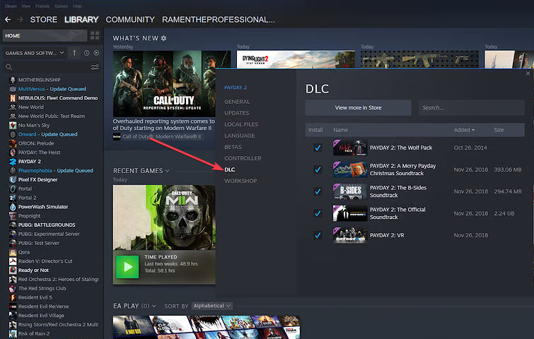 - Убедитесь, что Payday 2 VR находится в списке и активирован, затем скачайте/установите DLC.