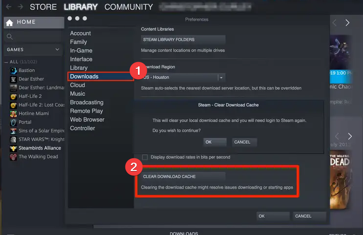 - Очистить кэш загрузок Steam