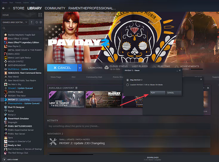 - В библиотеке Steam выберите Payday 2 и нажмите «Play». При наличии VR DLC игра предложит запустить VR‑режим.