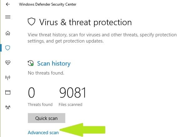 - Выполните полное сканирование Windows Defender (или вашего антивируса).