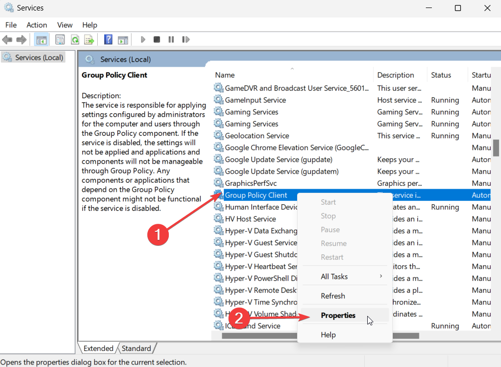 - Найдите службу Group Policy Client, щёлкните правой кнопкой → Свойства.