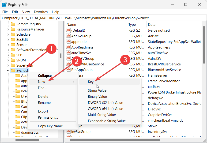 - Правой кнопкой на папке Svchost → Создать → Раздел (Key).