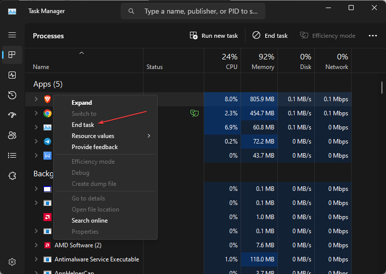 - Во вкладке «Производительность» и «Процессы» найдите приложения с высоким потреблением CPU/памяти и завершите их через «Завершить задачу».