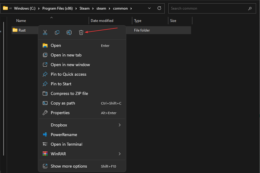 - В Steam → Библиотека → правой кнопкой по Rust → «Удалить».