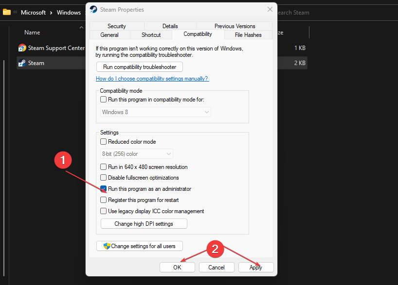 - Во вкладке «Совместимость» отметьте «Выполнять эту программу от имени администратора».