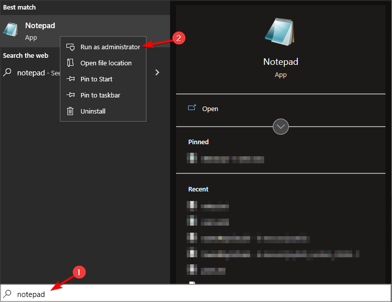 - Нажмите Windows + S, введите блокнот и запустите его от имени администратора.