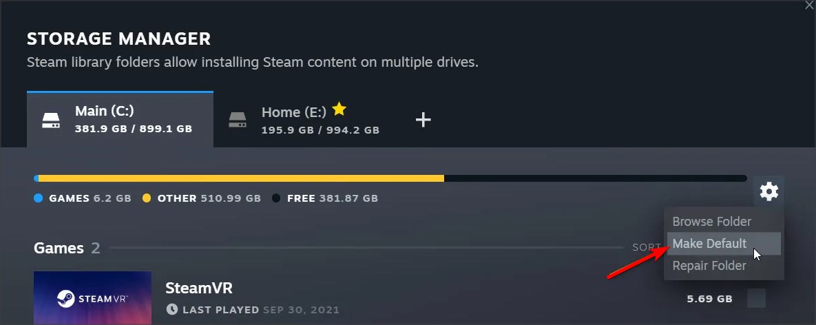 Метод применим, если у вас настроено несколько папок для библиотек Steam.