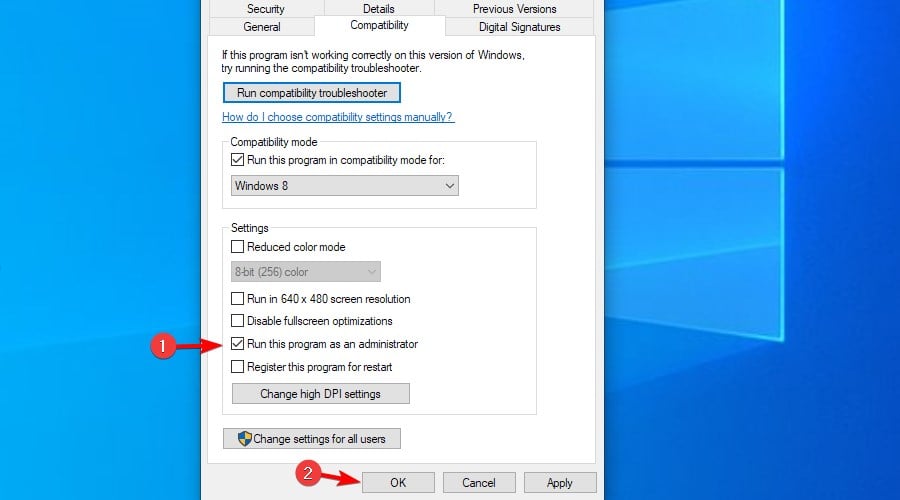 - Во вкладке Совместимость установите флажок Запускать эту программу от имени администратора. Примените изменения и закройте окно.